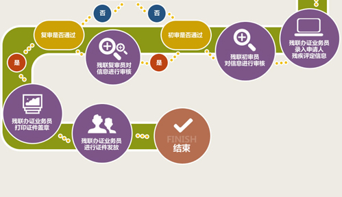 4、市级残联根据残疾标准和残疾人证管理办法,对申请人办证申请、县级残联的受理程序、残疾评定结果、县级残联的初审意见进行审核批准。